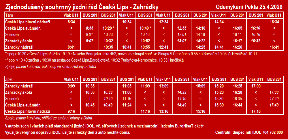 Z České Lípy do Zahrádek můžete využít pravidelné vlaky U11, nebo autobusovou linku 281, ta je v úseku Česká Lípa – Zahrádky v sobotu 25.4. posílena o 4 páry spojů. Veškerá spojení do Zahrádek a zpět uvádíme ve zjednodušeném souhrnném jízdním řádu.